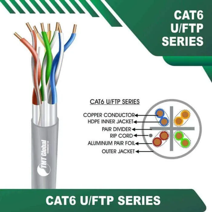 TMT Global Technology LTD aims to provide the best quality products, including structured cabling systems, copper and fiber optics range, access control systems, gate automation, lighting control systems, PIR motion sensors, UHF long-range readers, automatic parking solutions, SMATV systems, audio video intercom systems, audio visual systems, and public address systems. Industrial and building automation cables and accessories lead to customer satisfaction and reliability. All TMT Global products meet or exceed rigorous industry and regulatory standards for quality, reliability, and efficiency. From design and fabrication to finished product assembly, each phase in the manufacturing process is rigorously monitored and measured to ensure the highest quality, durability, and operating excellence.Cat6 u ftp 6x332BPXX PVC Cable 23 awg 4 pair 305m