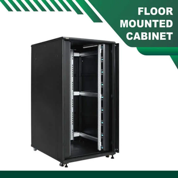 TMT GLOBAL Cabinet / Racks Manufactured from 1.5mm cold rolled carton sheet coated with polyester powered structure paint. With welded steel frame and gland plates at the top and bottom for cable entry. Two pairs of fully adjustable 2mm 19” profile With universal punching are fitted in every enclosure Wall mounting holes at the rear for easy mounting.18U Cabinet floor Mounted 600x800mm TMT GLOBAL cabinet/racks is designed for indoor wall mounted & Floor Standing using, cold-roll steel, with Vertical Cable Manager trays for