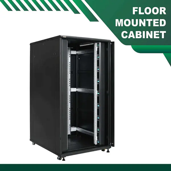 TMT GLOBAL Cabinet / Racks Manufactured from 1.5mm cold rolled carton sheet coated with polyester powered structure paint. With welded steel frame and gland plates at the top and bottom for cable entry. Two pairs of fully adjustable 27u floor standing rack 2mm 19” profile With universal punching are fitted in every enclosure Wall mounting holes at the rear for easy mounting.27U Cabinet floor Mounted 600 x 600mm TMT GLOBAL cabinet/racks is designed for indoor wall mounted & Floor Standing using, cold-roll steel, with Vertical Cable Manager trays for